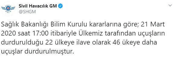 Sivil Havacılık Genel Müdürlüğü: Sağlık Bakanlığı Bilim Kurulu kararlarına göre; 21 Mart 2020 saat 17:00 itibariyle Ülkemiz tarafından uçuşların durdurulduğu 22 ülkeye ilave olarak 46 ükeye daha uçuşlar durdurulmuştur.