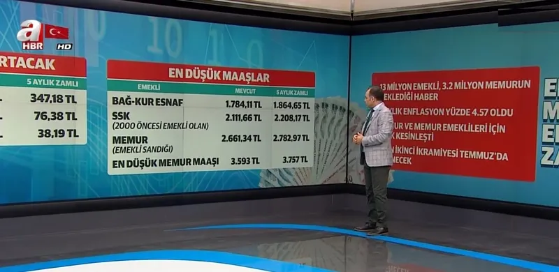 Son dakika haberi; Takvim Gazetesi Ekonomi Müdürü Faruk Erdem, açıklanan mayıs ayı enflasyon oranına ardın son 5 ayın ortalama enflasyon rakamlarını hesapladı ve milyonlarca emeklinin maaşlarına bu rakamların ne kadar zam olacak yansıyacağını canlı yayında açıkladı. Son 5 ayın enflasyon rakamı 4,57 oranında çıktığını söyleyen Erdem, bu oranla birlikte şu anda en düşük BağKur - Esnaf emeklisinin maaşının 1.864, SSK emeklisinin 2.208 memur emeklisinin 2.782 liraya yükseleceğini söyledi. Bu rakamların 3 Temmuz tarhinde açıklanacak olan haziran ayı enflasyon rakamına göre biraz daha artması beklenirken kesin zam oranının ise bu tarihte resmiyet kazanacağını ifade etti.