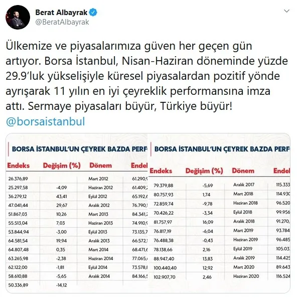 Bakan Albayrak, "Ülkemize ve piyasalarımıza güven her geçen gün artıyor. Borsa İstanbul, Nisan-Haziran döneminde yüzde 29.9'luk yükselişiyle küresel piyasalardan pozitif yönde ayrışarak 11 yılın en iyi çeyreklik performansına imza attı." açıklamasını yaptı.