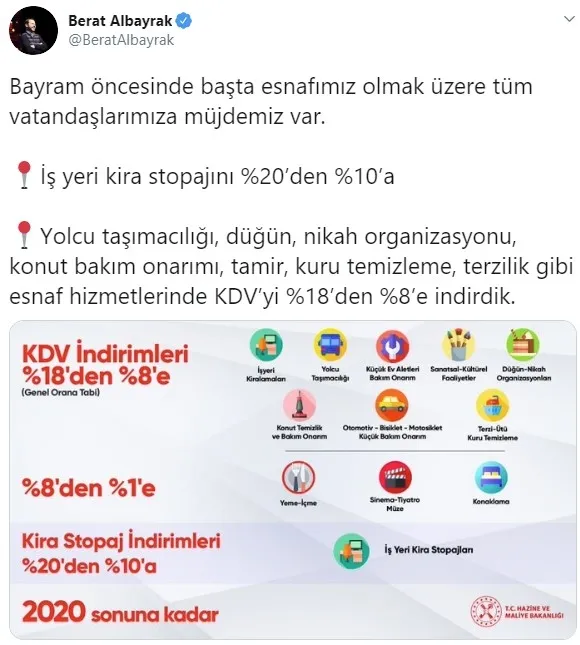 Hazine ve Maliye Bakanı Berat Albayrak yaptığı paylaşımda, "Bayram öncesinde başta esnafımız olmak üzere tüm vatandaşlarımıza müjdemiz var. İş yeri kira stopajını %20'den %10'a Yolcu taşımacılığı, düğün, nikah organizasyonu, konut bakım onarımı, tamir, kuru temizleme, terzilik gibi esnaf hizmetlerinde KDV'yi %18'den %8'e indirdik." ifadelerine yer verdi.