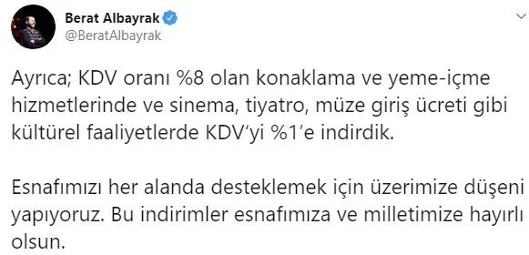 KDV'deki indirim müjdesini de veren Bakan Albayrak, "Ayrıca; KDV oranı %8 olan konaklama ve yeme-içme hizmetlerinde ve sinema, tiyatro, müze giriş ücreti gibi kültürel faaliyetlerde KDV'yi %1'e indirdik. Esnafımızı her alanda desteklemek için üzerimize düşeni yapıyoruz. Bu indirimler esnafımıza ve milletimize hayırlı olsun." açıklamasında bulundu.