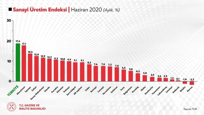 "Sanayi Üretimi Endeksindeki %17,6'lık artışla Türkiye, haziran ayında Avrupa sıralamasında ilk sırada yer aldı. Öncü ekonomik göstergelerdeki güçlü toparlanma, büyüme rakamlarıyla ilgili karamsar beklenti içerisinde olanları inşaallah bir kez daha hayal kırıklığına uğratacak."