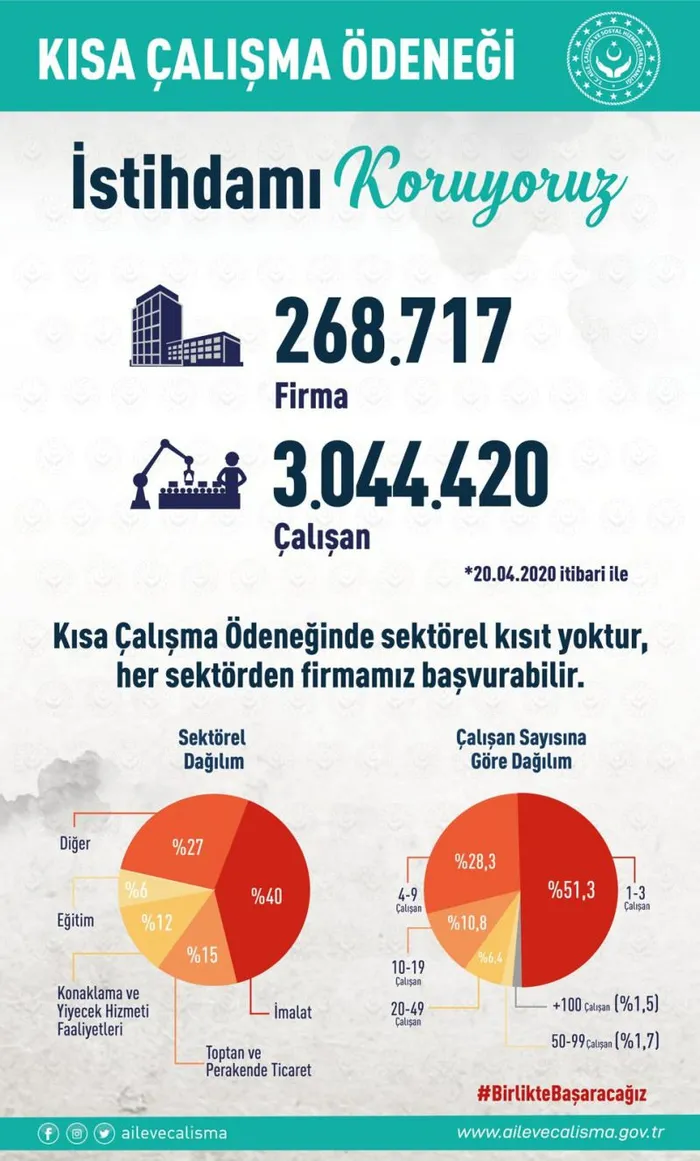 Sosyal medya hesabından yaptığı açıklamada, "Kısa Çalışma Ödeneği'nde sektörel kısıt yoktur, her sektörden firmamız başvurabilir" ifadelerini kullanan Bakan Selçuk, Kısa Çalışma Ödeneğinin sektörel ve çalışan sayısına göre dağılımını ilk kez paylaştı. Bakan Selçuk, şu değerlendirmeleri yaptı: