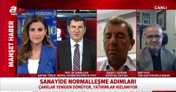 Son dakika haberi... Koronavirüsle mücadelede normalleşme adımlarına geçtiğimiz bu günlerde ekonomi de canlanıyor. Sanayi de çarklar yeniden dönerken yatırımlar da hızlanıyor. Medipol Üniversitesi Öğretim üyesi Prof. Dr. Kerem Alkin, Doğtaş CEO'su Davut Doğan, ve TOBB Hazır Giyim Meclis Başkanı Şeref Fayat, A Haber canlı yayınında konu ile ilgili açıklamalarda bulundu.