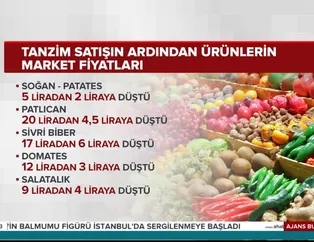 Tanzim satışların başlamasıyla marketlerdeki fiyatlar da düştü. 12 liradan satılan domatesin kilosu 3 liraya kadar düştü. Bu düşüş diğer tüm sebzelerin fiyatlarında en az yarı yarıya kadar yansıdı. Vatandaş hem tanzim satışı eleştirenlere hem de daha önce yüksek fiyattan ürün satışı yapan marketlere tepkili...