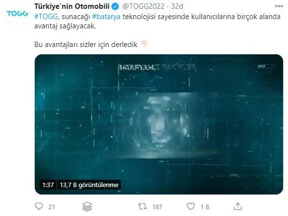 Türkiye'nin Otomobili Girişim Grubu'nun (TOGG) Twitter hesabından "TOGG, sunacağı batarya teknolojisi sayesinde kullanıcılarına birçok alanda avantaj sağlayacak" notuyla, "Batarya Teknolojilerimiz Hakkında Detaylar" konulu bir video paylaşıldı.