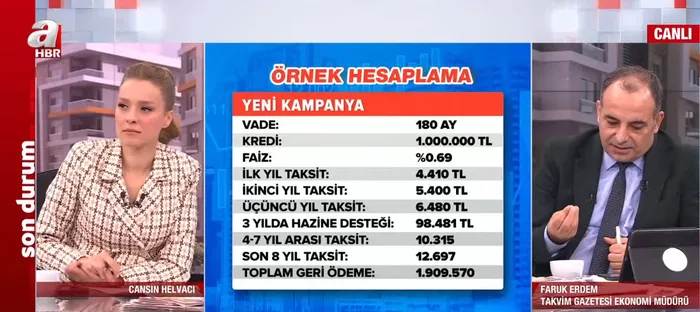 Çevre, Şehircilik ve İklim Değişikliği Bakanı Murat Kurum ile Hazine ve Maliye Bakanı Nureddin Nebati kameralar karşısına geçti, orta gelirliye konut projesinin detaylarını açıkladı. Bakanlık destekli proje kapsamında 0,69 faiz oranıyla 5 milyona varan kredi imkanı sunulacak. Peki kimler başvuracak? Şartlar neler? Hangi bölgeye ne kadar kredi? Taksitler ne kadar olacak? Geri ödeme ne kadar? Takvim Gazetesi Ekonomi Müdürü Faruk Erdem, A Haber canlı yayınında konu ile ilgili detayları anlattı.