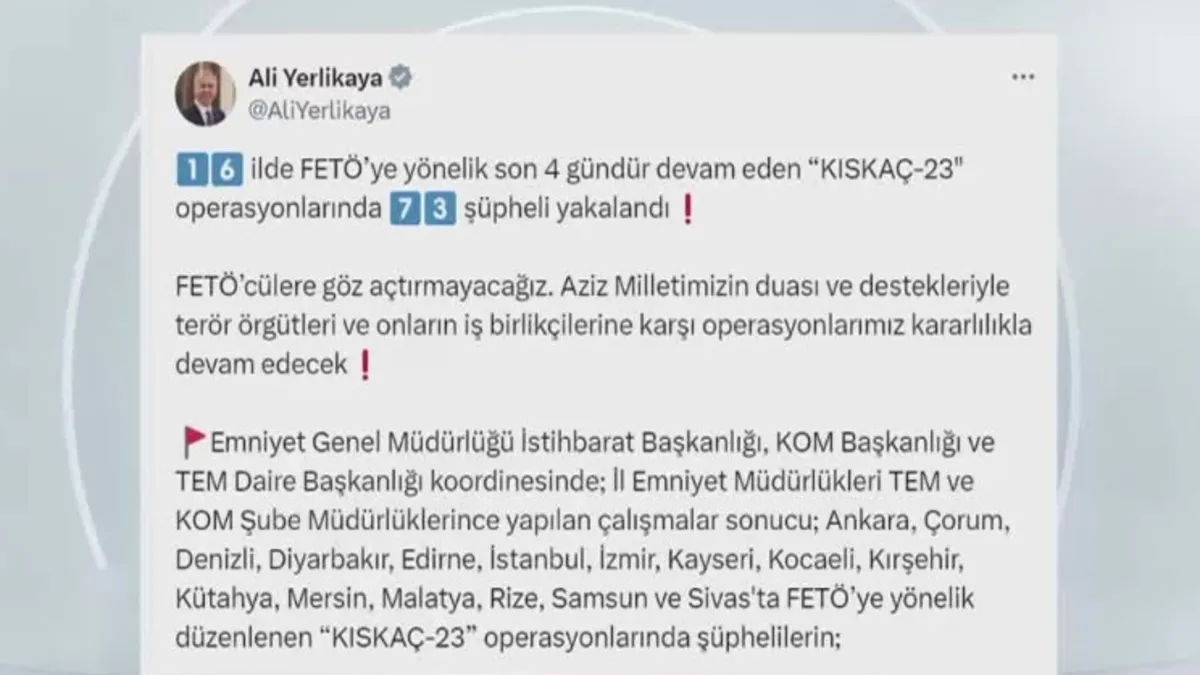 16 ilde FETÖ’ye kıskaç operasyonu! Terör örgütü FETÖ’ye yönelik 16 ilde icra edilen ve 4 gündür devam eden ’Kıskaç-23’ operasyonları çerçevesinde 73 şüpheli yakalandı.