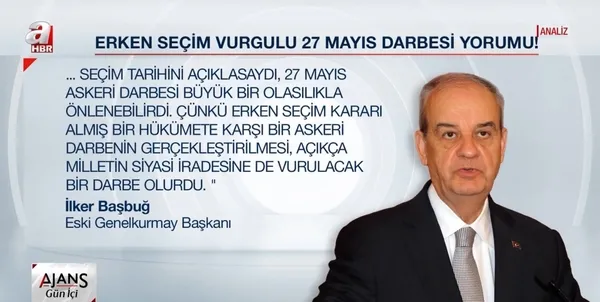 Merhum Başbakan Adnan Menderes'in o günlerde hata yaptığını dile getiren Başbuğ "Menderes erken seçime gideceğim deseydi darbe olmazdı" dedi. Aslında mesajı net ve belliydi. 60 darbesi üzerinden bugün ki iktidara erken seçim çağrısı yapıyordu.