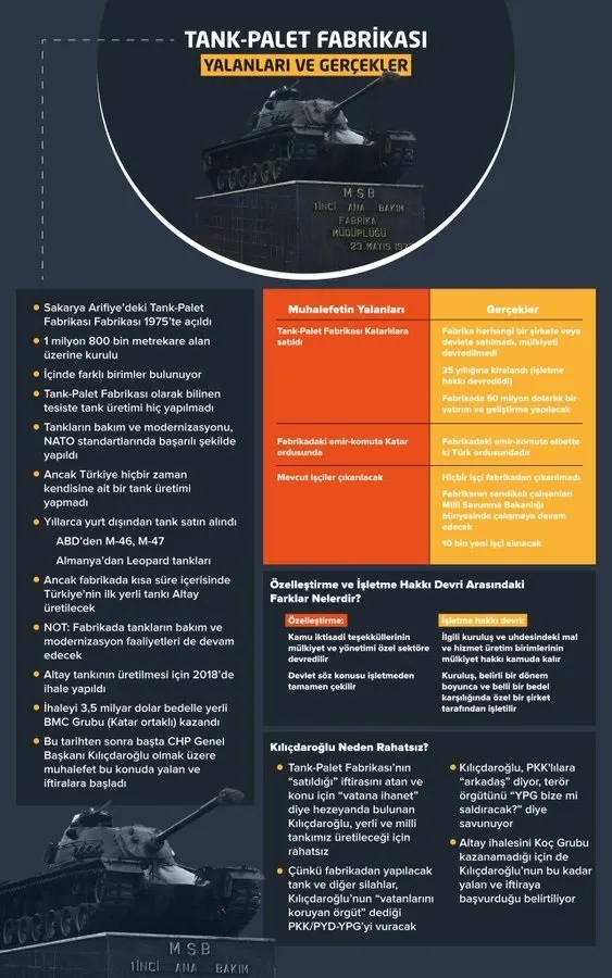 CHP Genel Başkanı Kemal Kılıçdaroğlu, tank palet fabrikasının katarlılara satıldığını ileri sürüp, hükümeti yerli ve milli olmamakla suçlamıştı. Kılıçdaroğlu'nun iddialarına yanıt, en yetkili ağızdan geldi.