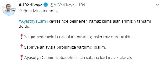 Yerlikaya, Twitter'dan, "Salgın nedeniyle bu alanlara misafir girişlerimiz durduruldu. Sabır ve anlayışla birbirimize yardımcı olalım. Ayasofya Camiimiz ibadetiniz için sabaha kadar açık olacak." mesajını paylaştı.