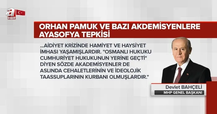 Bahçeli; "Bir yazar müsveddesinin, 'Ayasofya'yı yeniden camiye çevirmek dünyanın geri kalanına artık seküler değiliz demektir' ifadesi kafasının her zerresi dikenle sarılmış Pamuk soyisimli bir şahsın mesnetsiz sızlanmasıdır. Böylesi köksüzler düştükleri aidiyet krizinde hamiyet ve haysiyet imhası yaşamışlardır. 'Osmanlı hukuku Cumhuriyet hukukunun yerine geçti" diyen sözde akademisyenler de aslında cehaletlerinin ve ideolojik taassuplarının kurbanı olmuşlardır." dedi.