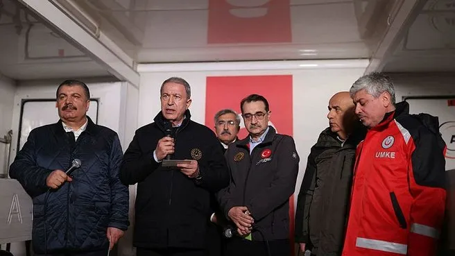 Bakan Hulusi Akar, Kahramanmaraş merkezli depremler sonrası arama kurtarma çalışmalarının sürdüğü Hatay'daki AFAD Koordinasyon Merkezinde Sağlık Bakanı Fahrettin Koca, Enerji ve Tabii Kaynaklar Bakanı Fatih Dönmez ve Tarım ve Orman Bakanı Vahit Kirişci ile açıklama yaptı.