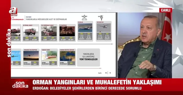 Orman yangınlarına ilişkini gazetecilerin sorularını A Haber canlı yayınında yanıtlayan Başkan Recep Tayyip Erdoğan, belediyelerin şehirlerden birinci derecede sorumlu olduğunu ifade etti. Yaşanan orman yangınlarında ise 8 şehidimizin olduğunu açıkladı.