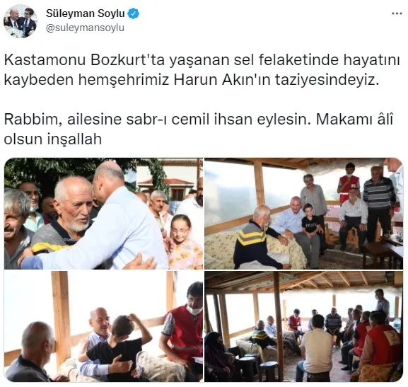 Sosyal medya hesabı Twitter'dan paylaşımda bulunan Bakan Soylu, "Kastamonu Bozkurt'ta yaşanan sel felaketinde hayatını kaybeden hemşehrimiz Harun Akın'ın taziyesindeyiz. Rabbim, ailesine sabr-ı cemil ihsan eylesin. Makamı âlî olsun inşallah" ifadelerine yer verdi.