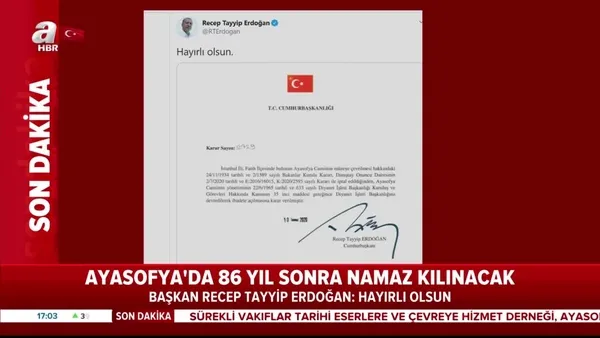 Son dakika haberi... Danıştay müze kararını iptal etti. Başkan Recep Tayyip Erdoğan kararnameyi imzaladı ve Ayasofya Camii ibadete açıldı. Başkan Erdoğan, sosyal medya hesabından "Hayırlı olsun" ifadeleriyle müjdeyi verdi.