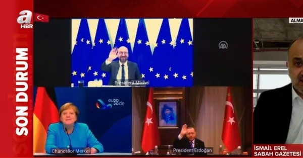 Başkan Recep Tayyip Erdoğan, Avrupa Birliği Konseyi Başkanı Charles Michel ve Almanya Şansölyesi Angela Merkel arasında üçlü zirve gerçekleşti. Görüşme sonrasında yapılan açıklamada Türkiye ve Yunanistan'ın Doğu Akdeniz'deki gelişmelerle ilgili hazır olduğu ifade edildi. Peki Erdoğan – Merkel görüşmesi Almanya'da nasıl yankı buldu? Sabah Gazetesi muhabiri İsmail Erel detayları A Haber canlı yayınında anlattı.