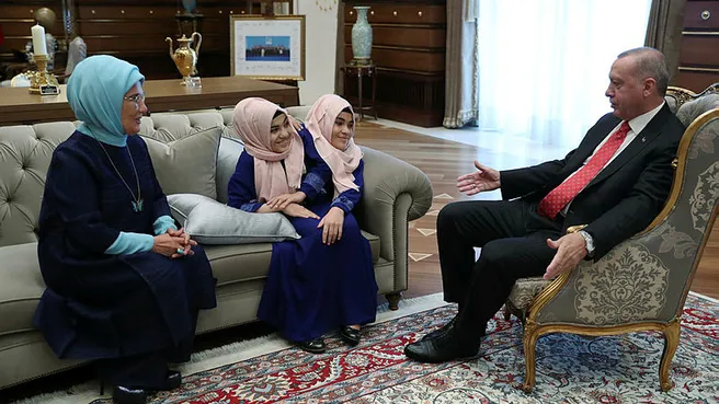 Başkan Recep Tayyip Erdoğan ve eşi Emine Erdoğan, Kahramanmaraş'ta yaşayan siyam ikizleri Sema ve Ayşe Tanrıkulu ile bir araya geldi.Basına kapalı gerçekleşen görüşmede Cumhurbaşkanı Erdoğan ve Emine Erdoğan, siyam ikizleriyle bir süre sohbet etti. Emine Erdoğan, ikizlerin pozitif enerjisinden etkilendiğini, gelecekte de bu enerjilerini sürdürmelerini isteyerek, eğitim hayatlarında başarılar diledi. Siyam ikizleri Ayşe ve Sema Tanrıkulu da aldıkları eğitimler hakkında bilgi vererek, gelecek planlarını paylaştı. Üniversiteye girmekten duydukları mutluluğu da dile getiren ikizler, üniversiteyi bitirince çalışmak istediklerini de kaydetti. Kabulde Kahramanmaraş Valisi Vahdettin Özkan'ın eşi Ruhan Özkan da hazır bulundu.