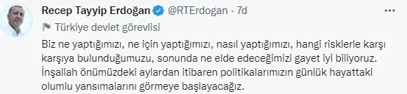 Biz ne yaptığımızı, ne için yaptığımızı, nasıl yaptığımızı, hangi risklerle karşı karşıya bulunduğumuzu, sonunda ne elde edeceğimizi gayet iyi biliyoruz. İnşallah önümüzdeki aylardan itibaren politikalarımızın günlük hayattaki olumlu yansımalarını görmeye başlayacağız.