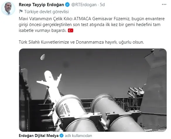 Başkan Erdoğan, "Atmaca Gemisavar füzemiz, bugün envantere girişi öncesi gerçekleştirilen son test atışında ilk kez bir gemi hedefini tam isabetle vurmayı başardı." açıklamasını yaptı