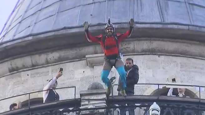Base Jump ustası Cengiz Koçak, bu sabah tıpkı 385 yıl önce olduğu gibi Galata’dan uçtu.