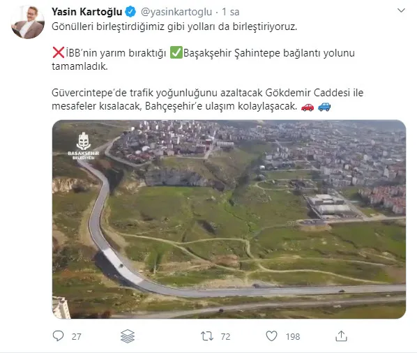 Başakşehir Belediye Başkanı Yasin Kartoğlu, sosyal paylaşım sitesi Twitter'da resmi hesabından açıklamada bulundu ve "Gönülleri birleştirdiğimiz gibi yolları da birleştiriyoruz. İBB'nin yarım bıraktığı Başakşehir Şahintepe bağlantı yolunu tamamladık. Güvercintepe'de trafik yoğunluğunu azaltacak Gökdemir Caddesi ile mesafeler kısalacak, Bahçeşehir'e ulaşım kolaylaşacak" dedi.