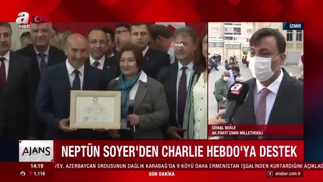 İzmir CHP'li Büyükşehir Belediye Başkanı Tunç Soyer'in eşi Neptün Soyer'in geçmiş yıllarda Charlie Hebdo dergisine destek olmak için Hz. Muhammed'e hakaretler yağdırılan bir baskısı ile çekilmiş bir fotoğrafını paylaşması İzmir’de tepkilere neden oldu. STK'lar Neptün Soyer'in bu skandal paylaşımına tepki gösterdi. A Haber canlı yayınında konuşan AK Parti İzmir Milletvekili Cemal Bekle, “Son derece talihsiz ve ne İzmirli ne de bu ülke vatandaşının kabul edebileceği bir paylaşım değildir. Bunu demokrasiyle, hoşgörüyle anlatmanız imkansız bir şeydir. Biz bunu kınıyoruz ve kabul etmiyoruz.” açıklamasını yaptı.