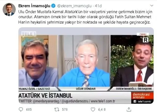 CHP yandaşı tutumuyla bilinen TELE1'de gazeteci Uğur Dündar'ın sunduğu ve Atatürk tüccarı Yılmaz Özdil'in de yorumcu olarak katıldığı Demokrasi Arenası'nın konuğu, İBB Başkanı Ekrem İmamoğlu'ydu.