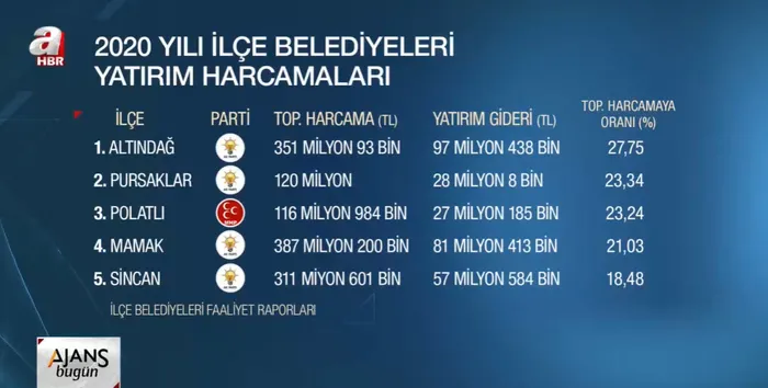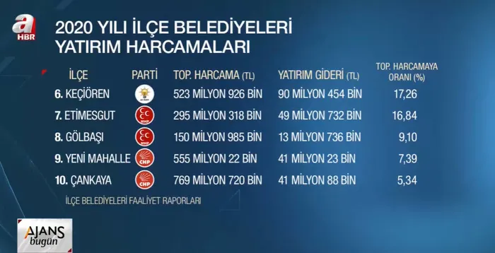 2020 yılında 351 milyon lira toplam harcama yapan Altındağ Belediyesi bunun 97 milyonunu yatırıma ayırdı. Çankaya Belediyesi'nde ise 769 milyon liralık toplam harcamanın yalnızca 41 milyon lirası yatırımlara ayrıldı.