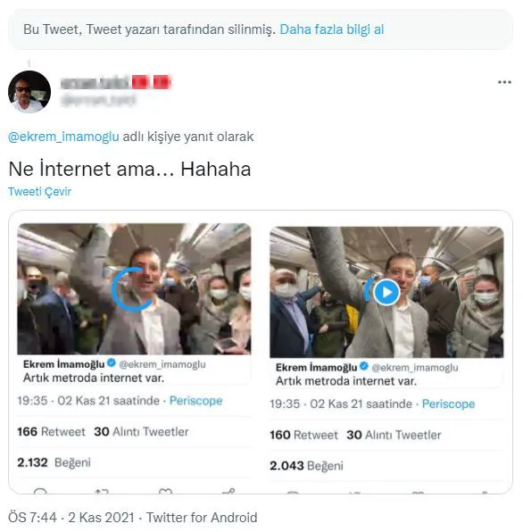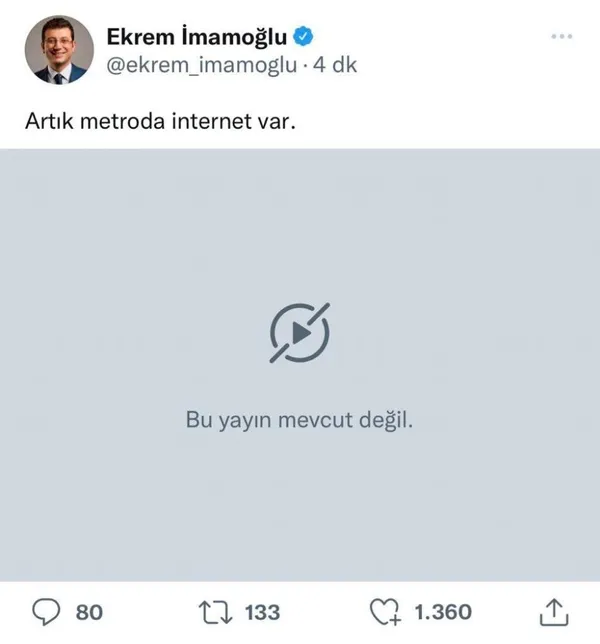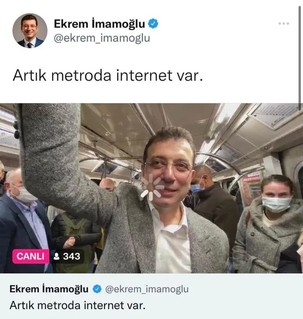İstanbul Büyükşehir Belediye Başkanı Ekrem İmamoğlu, Yenikapı – Hacıosman metrosunda ücretsiz Wi-Fi hizmeti başlattığını duyurmak için metrodan canlı yayın yaptığı sırada interneti kesildi. Tweet kısa sürede silindi.