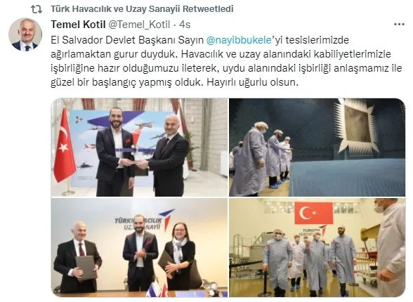 El Salvador Cumhurbaşkanı Nayib Bukele'yi tesislerinde ağırlamaktan gurur duyduklarını belirten Kotil, "Havacılık ve uzay alanındaki kabiliyetlerimizle iş birliğine hazır olduğumuzu ileterek, uydu alanındaki iş birliği anlaşmamız ile güzel bir başlangıç yapmış olduk." ifadesini kullandı.