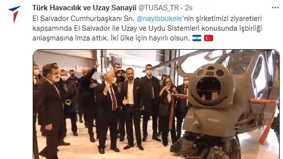 TUSAŞ Genel Müdürü Temel Kotil, Twitter hesabından, El Salvador Cumhurbaşkanı Nayib Bukele'nin TUSAŞ'a yaptığı ziyarete ilişkin bilgi verdi.