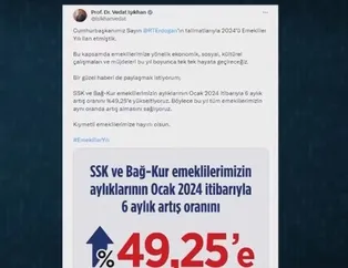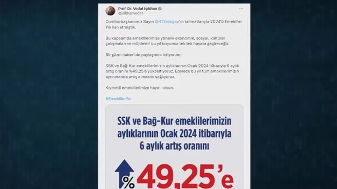 Çalışma ve Sosyal Güvenlik Bakanı Işıkhan, SSK ve Bağ-Kur emeklilerine yapılacak zam oranının ocak ayı itibarıyla yüzde 49,25'e yükseltildiğini bildirdi.