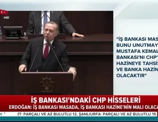 Başkan Erdoğan: İş Bankası masada bunu unutmayın. Gazi Mustafa Kemal İş Bankası'nı CHP'ye değil Hazine'ye tahsisi vardır. İş Bankası Hazine'nin malı olacaktır. Bu parlamento bu tarihi kararı da alacaktır Allah'ın izniyle.