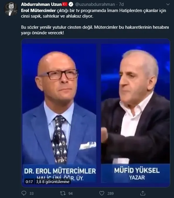 Haliç Üniversitesi Öğretim Üyesi Dr. Erol Mütercimler, yazar Müfid Yüksel ile girdiği tartışma sırasında sesini yükseltti ve imam hatip mezunlarını hedef aldı. Müfid Yüksel, "Saint Joseph, Saint Michel, Saint Benol kimlerin kurduğu okullar, bizim papazların kurduğu okullar" derken, Mütercimler, "Ama sonuca bakı, o imam hatipten mezun olanlar bakın karşımıza ne olarak çıkıyor, sahtekar, cinsi sapık, ahlaksız" dedi.