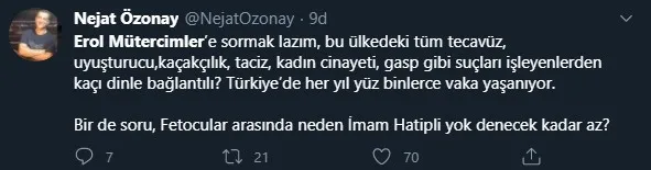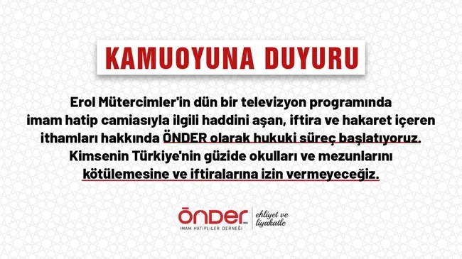 ÖNDER İmam Hatipler Derneği bir açıklama yaparak haddini aşan Erol Mütercimler'e tepki gösterdi ÖNDER açıklamasında, "Erol Mütercimler'in imam hatip camiasıyla ilgili haddini aşan, iftira ve hakaret içeren ithamları hakkında ÖNDER olarak hukuki süreç başlatıyoruz. Kimsenin Türkiye'nin güzide okulları ve mezunlarını kötülemesine ve iftiralarına izin vermeyeceğiz." ifadelerini kullandı.