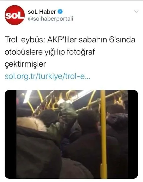 Sol Haber Portalı adlı internet sitesi de; Twitter hesabından 29 Mart 2020 tarihinde saat:10.52'de paylaşımda bulundu ve "Trol-eybüs: AKP'liler sabahın 6'sında otobüslere yığılıp fotoğraf çektirmişler" iddiasında bulundu.