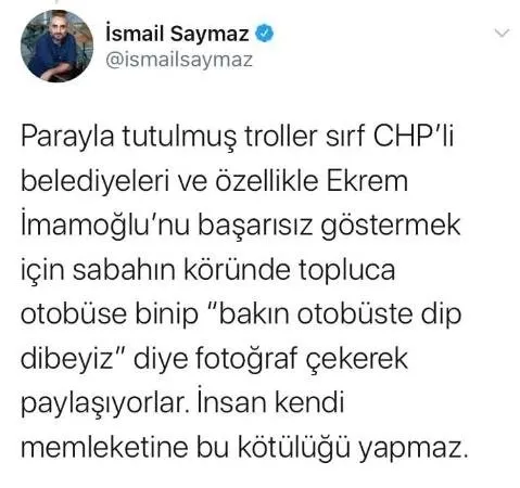 İsmail Saymaz, 29 Mart 2020 tarihinde saat:18.01'de yaptığı paylaşımda ise; "Parayla tutulmuş troller sırf CHP'li belediyeleri ve özellikle Ekrem İmamoğlu'nu başarısız göstermek için sabahın köründe topluca otobüse binip 'Bakın otobüste dip dibeyiz' diye fotoğraf çekerek paylaşıyorlar. İnsan kendi memleketine bu kötülüğü yapmaz" iddiasında bulundu.