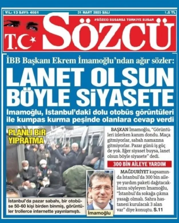 Sözcü Gazetesi de, 30 Mart 2020 tarihli sayısının birinci sayfasında; "Lanet olsun bu siyasete" başlıklı haberinde, İstanbul Büyükşehir Belediyesi Başkanı Ekrem İmamoğlu'nun sözleri yer aldı. Haberde; "İmamoğlu İstanbul'daki dolu otobüs görüntüleri ile kumpas kurma peşinde olanlara cevap verdi" ifadeleri yer aldı. Haberde; otobüste yolcu yoğunluğunu gösteren fotoğraf yer aldı ve "Planlı bir yıpratma" ifadeleri yer aldı.