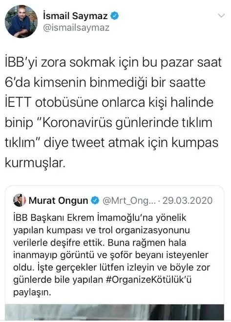 İsmail Saymaz; 29 Mart 2020 Saat:23.25'de yaptığı paylaşımda; "İBB'yi zora sokmak için bu pazar saat 6'da kimsenin binmediği bir saatte İETT otobüsüne onlarca kişi halinde binip 'Koronavirüs günlerinde tıklım tıklım' diye tweet atmak için kumpas kurmuşlar" iddiasında bulundu.