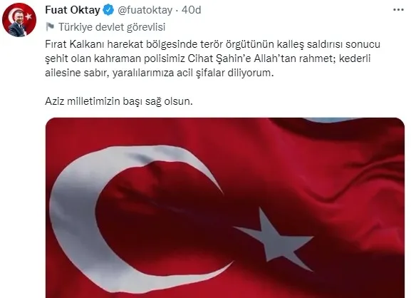 Cumhurbaşkanı Yardımcısı Fuat Oktay, Fırat Kalkanı Harekat Bölgesi'nde şehit olan özel harekat polisi Cihat Şahin'e Allah'tan rahmet, ailesine başsağlığı diledi.