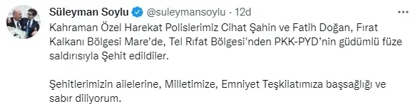 Bu haberden sonra yeni bir açıklama yapan İçişleri Bakanı Süleyman Soylu, "Kahraman Özel Harekat Polislerimiz Cihat Şahin ve Fatih Doğan, Fırat Kalkanı Bölgesi Mare'de, Tel Rıfat Bölgesi'nden PKK-PYD'nin güdümlü füze saldırısıyla Şehit edildiler. Şehitlerimizin ailelerine, Milletimize, Emniyet Teşkilatımıza başsağlığı ve sabır diliyorum." dedi.