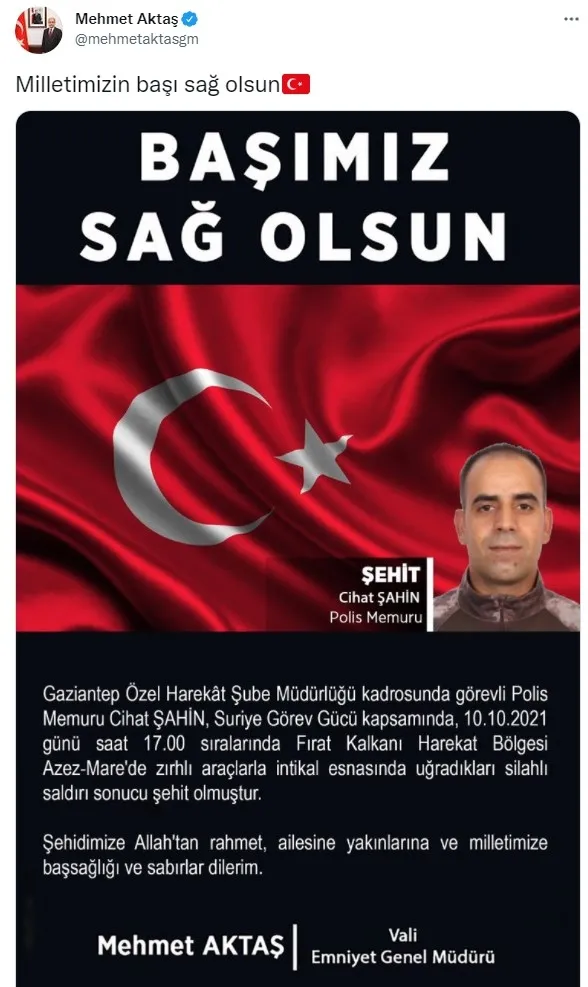 Aktaş, mesajında, "Gaziantep Özel Harekat Şube Müdürlüğü kadrosunda görevli polis memuru Cihat Şahin, Suriye Görev Gücü kapsamında 10 Ekim 2021 günü saat 17.00 sıralarında Fırat Kalkanı Herekat Bölgesi Azez-Mare'de zırhlı araçlarla intikal esnasında uğradıkları saldırı sonucu şehit olmuştur. Aziz şehidimize Allah'tan rahmet, ailesine ve milletimize başsağlığı ve sabırlar dilerim." ifadelerini kullandı.
