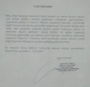 Türkiye'de tedavisini yapan doktor Oğuz Çayan, kanser Emine Eşkil'in Türkiye'ye acilen getirilmesi için bir rapor hazırladı. Bu raporda Emine Eşkil'in sağlık durumu hakkında bilgi yer aldı. Doktor, kendisi tarafından yapılan tedavinin Fransa'da uygulanamadığından kaynaklı hastası Emine Eşkil'in hastalığında kötüleşme meydana geldiği ve acilen Türkiye'ye getirilmesi gerektiği belirtildi.