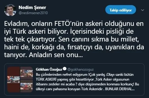 Nedim Şener, "Evladım, onların FETÖ'nün askeri olduğunu en iyi Türk askeri biliyor. İçerisindeki pisliği de tek tek çıkartıyor. Sen canını sıkma bu millet, haini de, korkağı da, fırsatçıyı da, uyanıkları da tanıyor. Anladın sen onu..." diye yazdı.