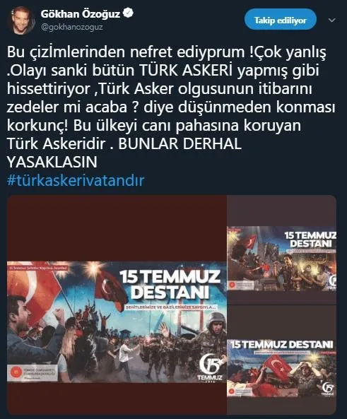 Athena grubu solisti Gökhan Özoğuz, kişisel Twitter hesabından, 15 Temmuz afişlerini eleştiren bir paylaşımda bulundu.