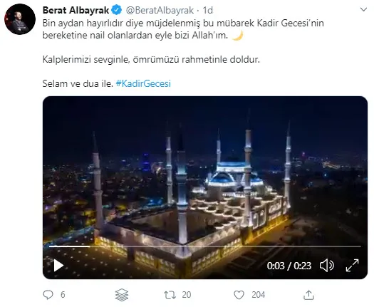 Hazine ve Maliye Bakanı Berat Albayrak, Twitter hesabından Kadir Gecesi için bir videolu mesaj paylaştı.