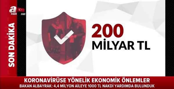 Şu ana kadar yaklaşık 4,4 milyon aileye bin TL'lik nakdi destek sağlandığını ifade eden Albayrak, "Ayrıca destek kapsamına girmeyen, ancak bu dönemde gelirini, işini kaybeden vatandaşlarımıza da bin TL nakdi yardım yapacağız. Bu kapsamda e-devlet üzerinden başvuruları başlattık" diye konuştu.
