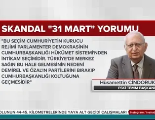 Eski Meclis Başkanı Hüsamettin Cindoruk, 31 Mart yerel seçimlerine ilişkin skandal ifadeler kullandı. Önümüzdeki seçimleri, "Parlamenter demokrasinin Cumhurbaşkanlığı Hükümet Sistemi'nden intikamı" olarak niteledi. Cindoruk, adı sahne senet skandalına karışan Millet İttifakı'nın Ankara adayı Mansur Yavaş'a destek istedi.