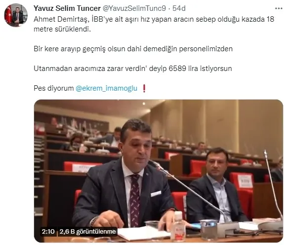 ...Günün sonunda bugün itibari ile bana gelen bir haberde, tabi bu yaptıkları yetmiyormuş gibi Ahmet Demirtaş kardeşimden de 'elektrikli scooter bizim aracımıza zarar verdi' diye 6 bin 580 TL para talep edilmiştir. Tabi bizler de belediyecilik yapıyoruz. Kaza olabilir. Ancak bu cezai işlemi gerçekleştirmek ne kadar ahlakidir, ne kadar vicdanidir ne kadar insanidir ne kadar İslamidir? Ben İstanbul kamuoyunun takdirine sunuyorum."
